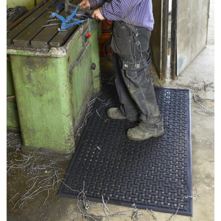 Mycket slitstark arbetsplatsmatta med durkmönstrat ytskikt för bästa halksäkerhet även vid vätskespill. Mjuk och dämpande undersida i polyvinyl ger bra ergonomi och komfort. Ytskikt och undersida är sammansmälta vilket bidrar till bästa hållfasthet och att miljöfarligt lim kan undvikas. Fasade kanter minskar snubbelrisken och underlättar för att köra vagnar över mattan.