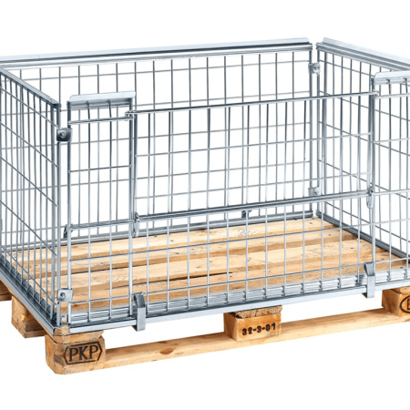 Pallram anpassad för EUR pall (1200×800 mm) . Går att fälla ihop då den inte används, stapelbar. Öppningsbar långsida. Finns i fler utföranden och storlekar.