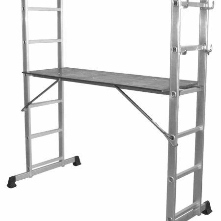 Fälls lätt ihop till ett behändigt format, 0,96×0,37×0,27. Tvådelad förzinkad iläggskiva ingår. Stegen tillverkas i aluminium och de kraftiga lederna i förzinkad stål.