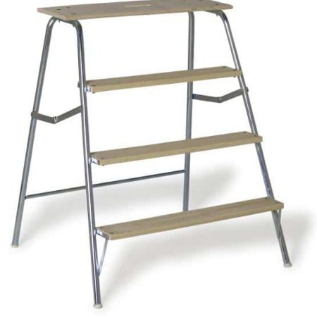 Vår trappstege Safestep är en stabil och robust arbetsplattform som tål tufft arbete. Trappstegen är tillverkad i aluminium och utrustad med fällbart räcke på två sidor samt en 850 mm hög skyddsbåge försedd med aluminiumhylla och låsbart lock. För transport inom arbetsplatsen är Safestep standardutrustad med hjul på de bakre vangstyckena.