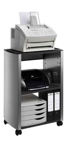 Multifunktionell förvaringshurts med två fasta hyllor och en justerbar mittenhylla. För förvaring av t ex pärmar och annat kontorsmaterial. Tillverkad av metall med reptålig polyesterbeläggning. Handtag på båda sidor. Hurtsen är utrustad med fyra vridbara hjul som underlättar förflyttning. Två av hjulen är försedda med bromsar vilket ger stabilitet under användning. Mått: 820x575x380 mm (HxBxD).