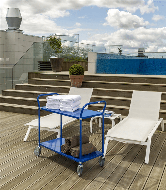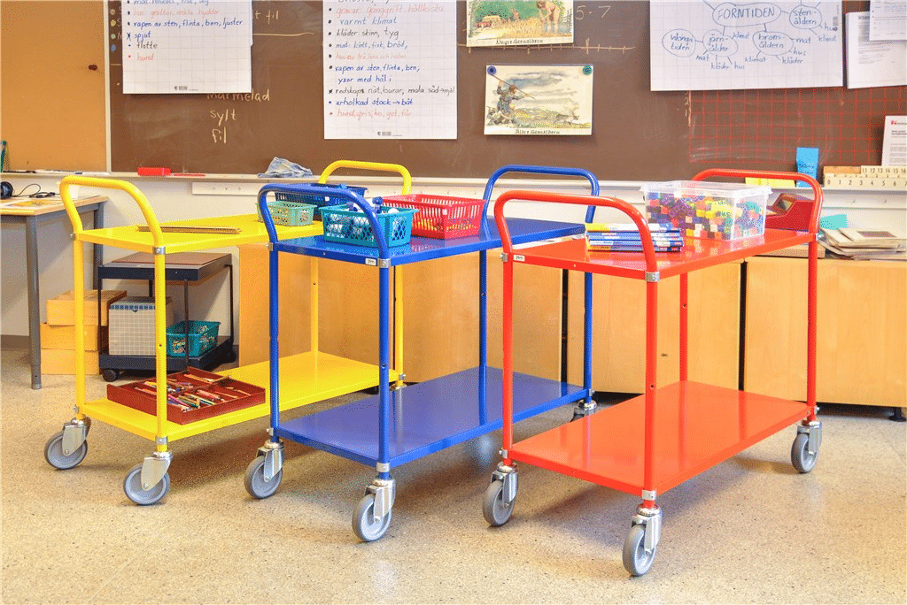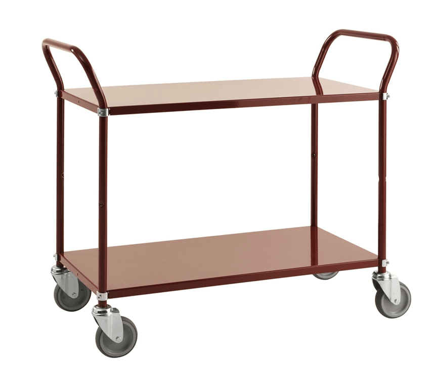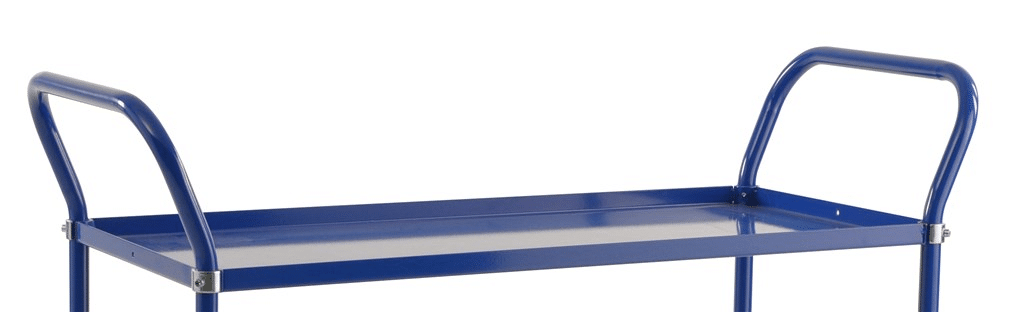 Plåtvagn i 2 plan. Hyllplanen kan monteras med kant upp eller ner efter eget önskemål. Rejäla 125mm hjul vilket gör den lätt att köra. Finns som standard i 16 modeller. Levereras omonterat. Pulverlackerad eller elförzinkad Höjd till översta hyllplan 760 mmAvstånd mellan hyllplan 530 mmKan monteras med hyllkant upp och nerHyllplan 900 x 440 mm4 länkhjul 125 mmBelastning: 250 kg