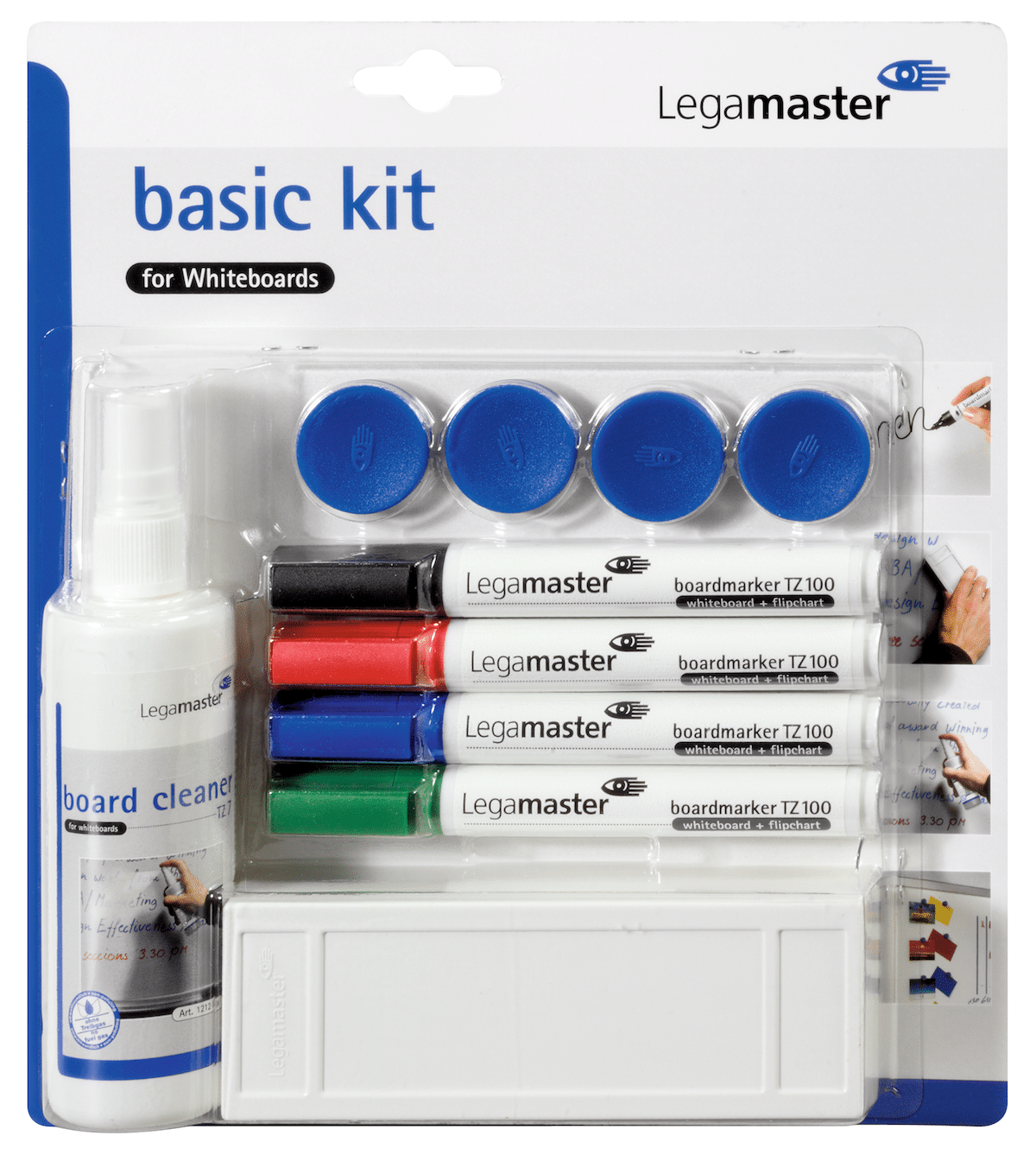 Whiteboard Startset Basic Allt ni behöver för att snabbt komma igång med er whiteboard! Innehåller 4 st märkpennor (svart, grön, röd och blå), 1 magnetisk tavelsudd, 1 flaska whiteboardrengöring (125 ml) samt 4 starka magneter (30 mm i diameter)
