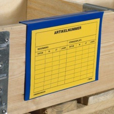Tillverkade i en mörkblå köldhärdad miljövänlig (DINP) plast med en glasklar tunnare plast som framsida. Tillverkade med en formpressad övervikning på baksidan vilket ger en enkel och stabil infästning på pallkragen. Förpackning om 100 st.