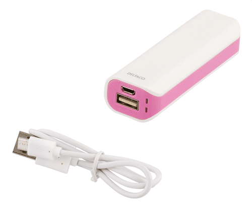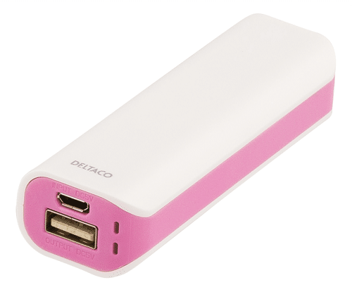 DELTACO Power bank, portabelt batteri för laddning av mobila enheter, 2000mAh, USB 5V 0,8A, vit/rosa