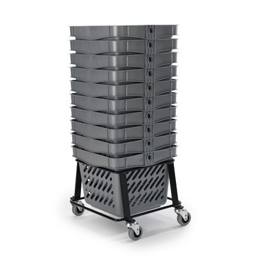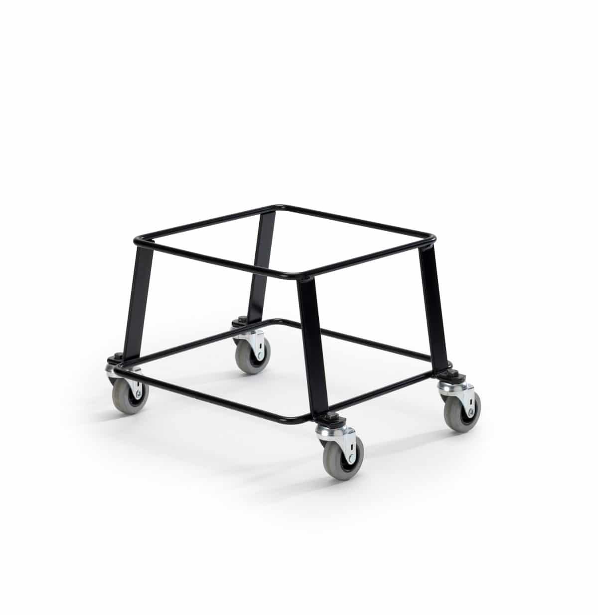 Liten stabil, svartlackerad vagn i stål till vår butikskorg ”Mini”. Levereras med 4 lättrullade hjul med gummibeläggning som är skonsam för alla typer av underlag.