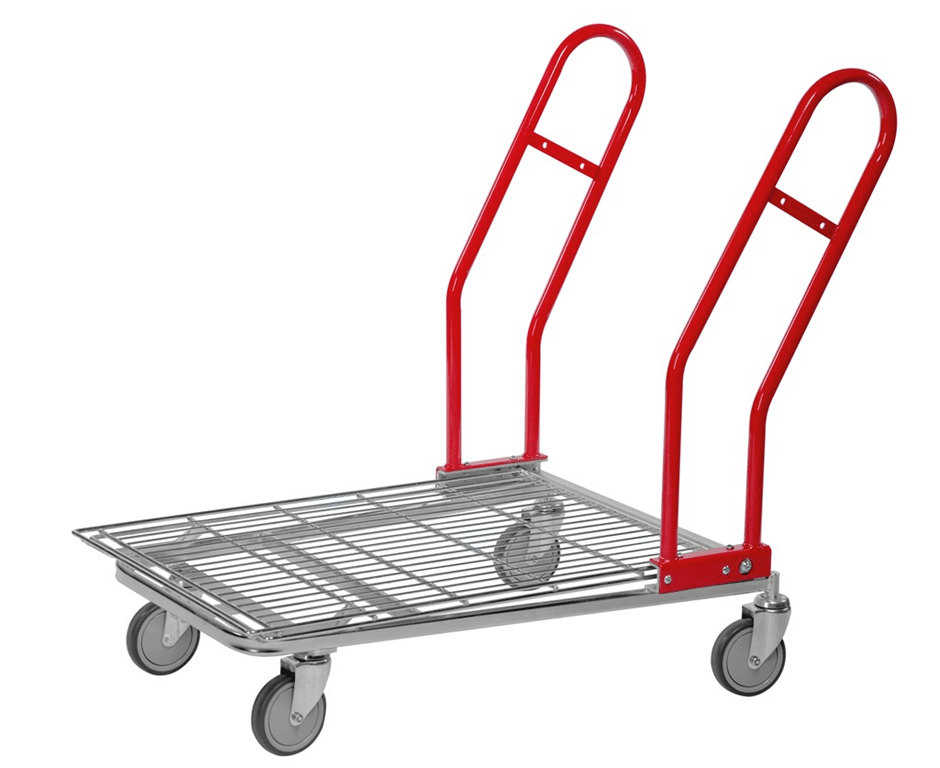 Volymvagn med lastplan i tråd. Stackningsbar. Levereras omonterad.
