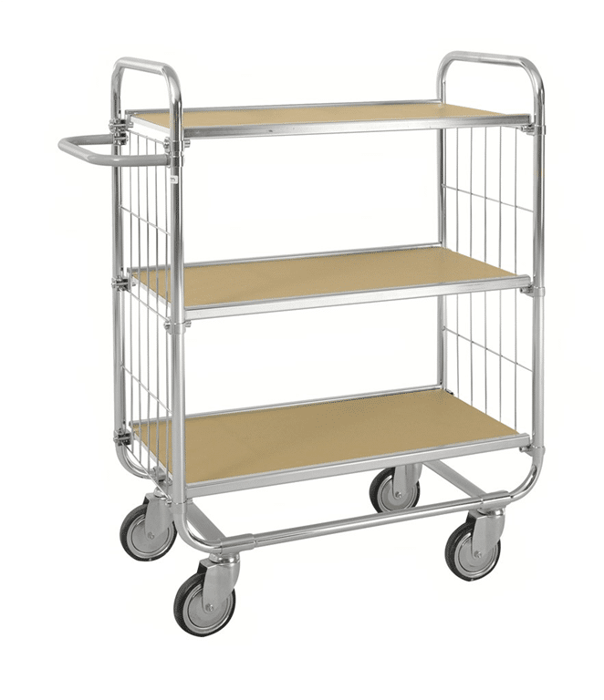 Flexibel hyllvagn med ett brett användningsområde. Hyllorna kan monteras på olika höjder efter eget önskemål. Levereras omonterad. Elförzinkad med ESD hyllorHyllplan steglöst ställbara i höjdJusterbart handtag4 länkhjul 125 mmBelastning: 250 kg