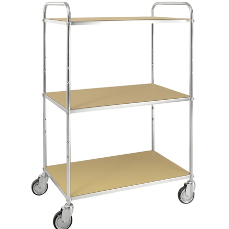 Flexibel hyllvagn med ett brett användningsområde. Hyllorna kan monteras på olika höjder efter eget önskemål. Levereras omonterad. Elförzinkad med ESD hyllorHyllplan steglöst ställbara i höjdJusterbart handtag4 länkhjul 125 mmBelastning: 250 kg