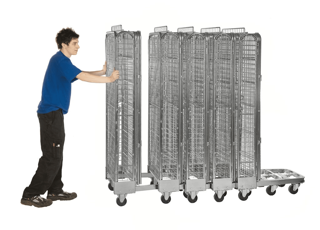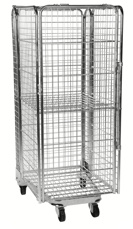 Stackningsbar säkerhetscontainer med 3 sidor, dörr och tak, inkl. 1 hylla. Finns i flera olika modeller. Elförzinkad, stackningsbarNätets maska 50 x 50 mmÖppning på 820 mm sidanInvändigt mått: 810 x 660 x 1500 mmMonteras utan verktyg1 hylla inkl. tak2 fasta och 2 länkhjul 100 mm Belastning 400 kg