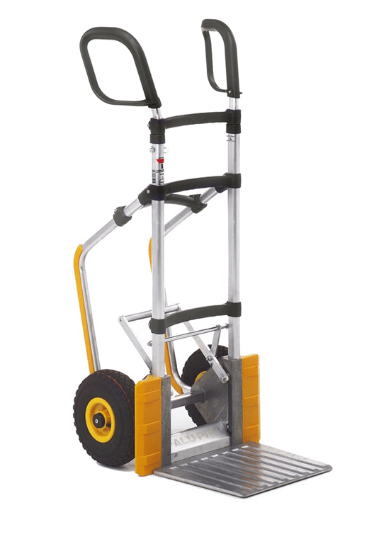 Exklusiv kärra, helt i aluminium. Ergonomisk i sitt utförande med justerbara handtag och tipphjälp. Glidskenor som gör att den även är lätt att hantera i trappor. Fällbart lastplan