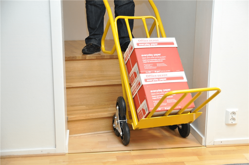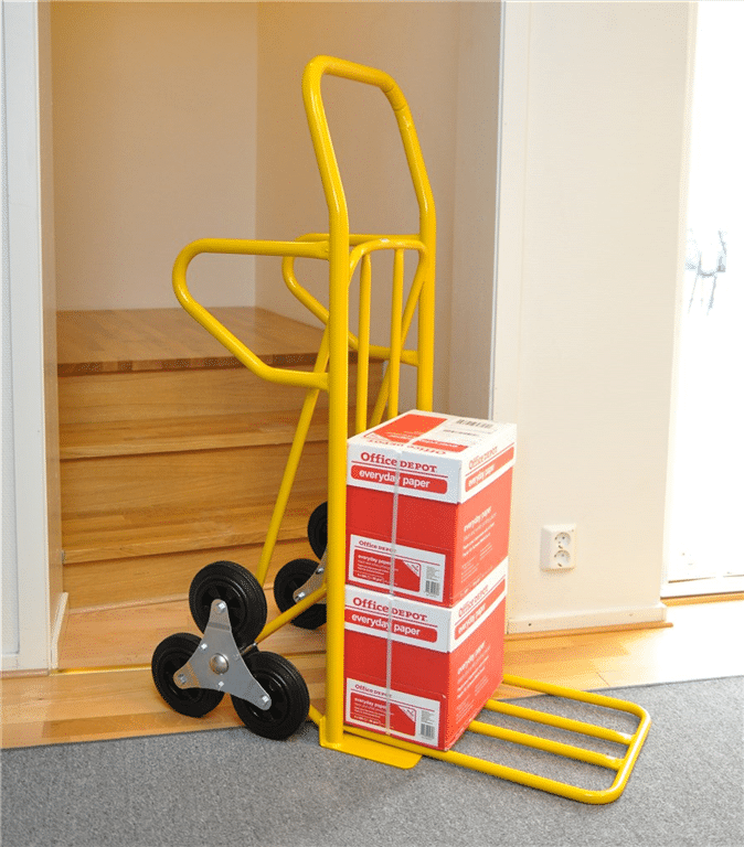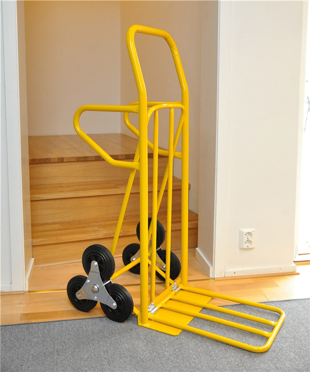 Kraftig kärra som är anpassad för trappor. Gör det otroligt enkelt att flytta gods i båda riktningar. Fällbart lastplan. Pulverlackerad.