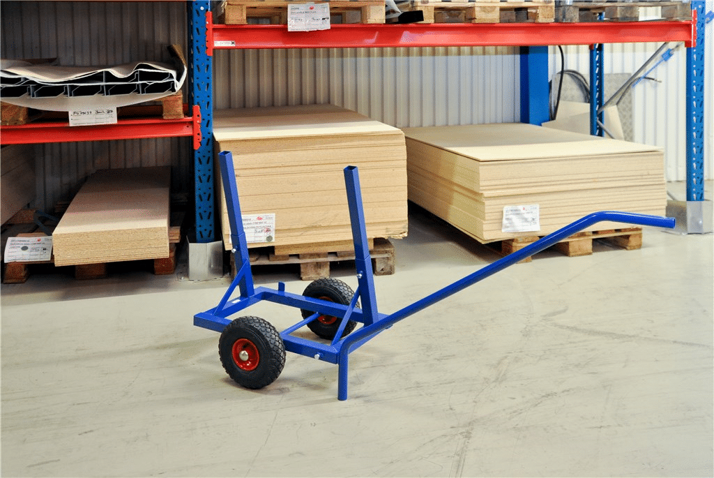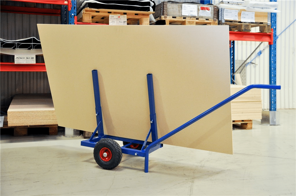 Smidig kärra som är anpassad för skivmaterial. De 2 rören kan enkelt justeras i höjd (280 – 830mm) vid hantering av större skivor. Pulverlackerad2 handtagsfästen som gör att handtaget blir vändbartLängd: 600 mm, med draghandtag 1600 mmLastbredd 90 mmLuftgummihjul 260 mmBelastning: 200 kg